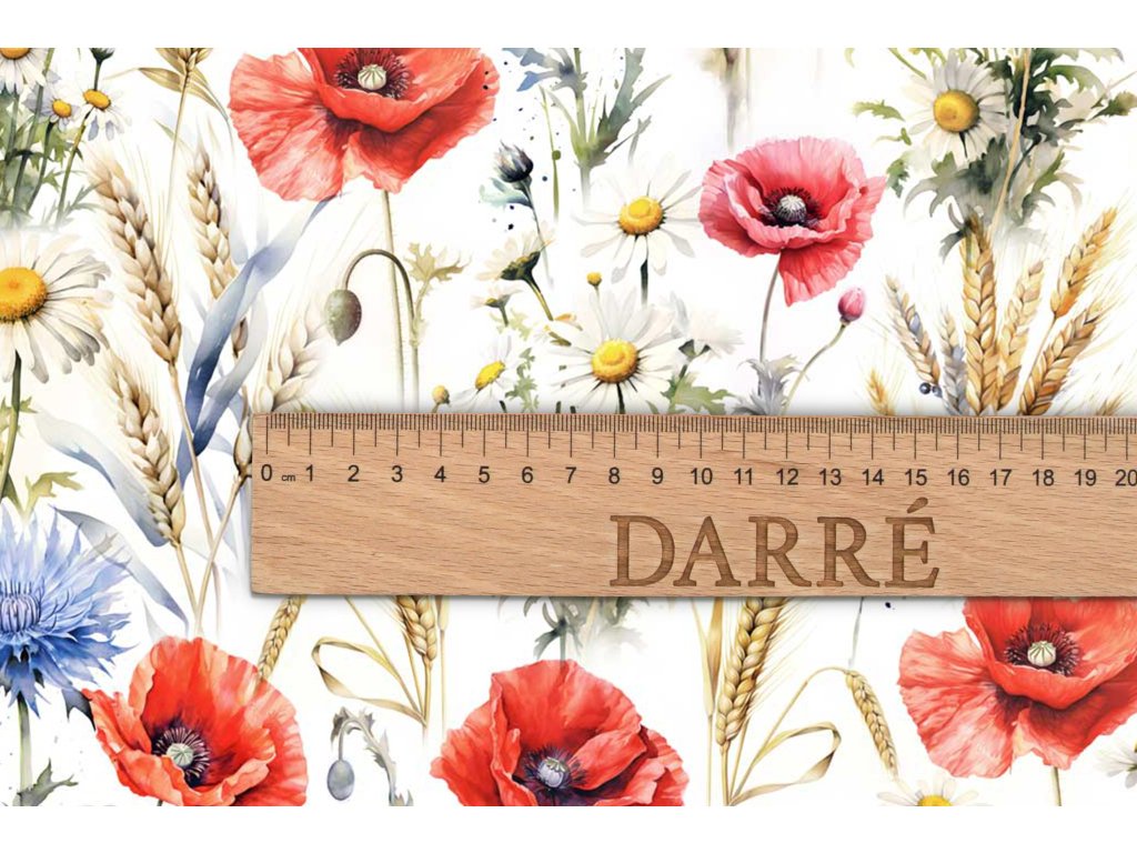 Naša bavlnená plátno so vzorom Catherine v sebe ukrýva esenciu letnej lúky, zobrazenú v živých farbách a realistickom štýle. Rozkvitnuté maky a chrpy sú premiešané s láskyplnými harmančekmi a zlatými klasmi obilia, vytvárajúc materiál, ktorý je ideálny pre všetkých, ktorí túžia po dotyku prírody vo svojich šiacich projektoch.