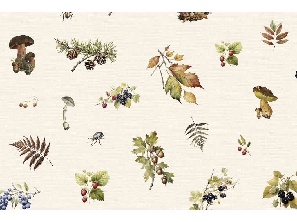 Bavlnené plátno s názvom Jesenné plody je inšpirované jesennou prírodou. Na jemnom svetlom pozadí sa objavujú živé maľované ilustrácie lesných pokladov. Medzi vzormi nájdeme rôzne druhy hríbov a bedlí, ktoré sa pýšia svojimi charakteristickými tvarmi a zemnými odtieňmi hnedej a béžovej. Zelené vetvičky borovice s tmavými šiškami dopĺňajú obraz zrelého lesa, zatiaľ čo pestrofarebné listy a bobule pridávajú vzoru farebnosť a hĺbku. Scénu oživujú živé tvory – malý chrobák a spevník, pridávajú k obrazu jemný dotyk divokej prírody. Tento dizajn prináša pocit pokojnej prechádzky lesnou čistinkou, kde každý kus látky rozpráva svoj príbeh o zhromažďovaní jesenných darov prírody.