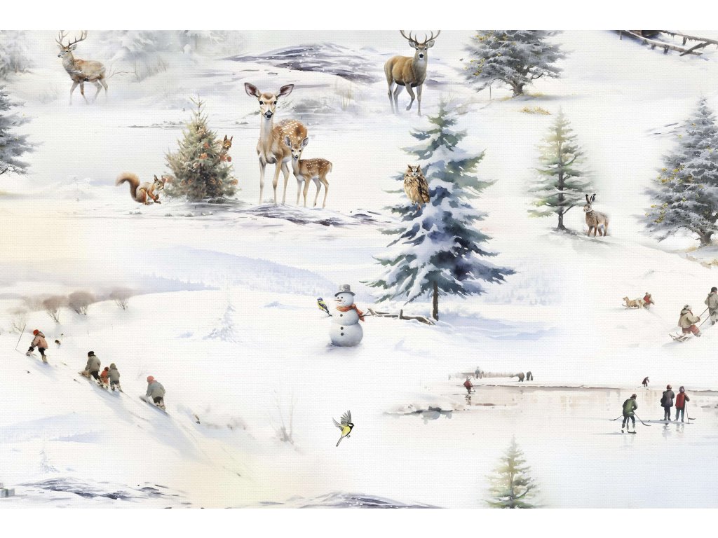 Naše bavlnené plátno so vzorom Vianoce v prírode, ktoré je viac než len tkanina. Je to rozprávkový príbeh, ako príroda oslavuje sviatočný čas. Veveričky, srnky a zajace sa stretávajú s radostnými deťmi, korčuľujúcimi na rybníku, vytvárajúc harmóniu zimného pokoja a šťastia.