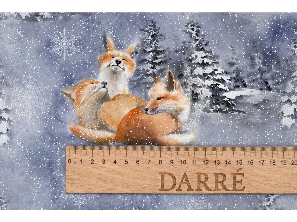 Naše bavlnené plátno so vzorom Zimná rozprávka, ktoré vám prináša kúsok kúzelnej zimnej krajiny, kde sú líšky a veveričky v zasneženej kráse. Táto tkanina nie je len dekoračný prvok pre váš interiér; je to umelecký príbeh zimnej radosti.