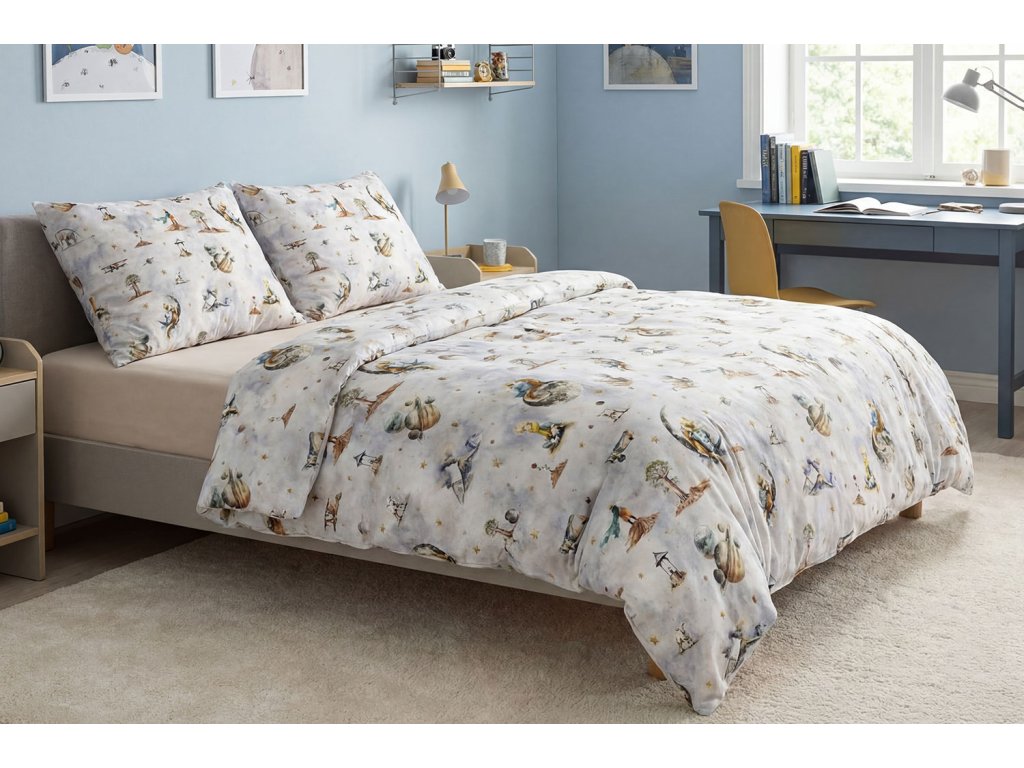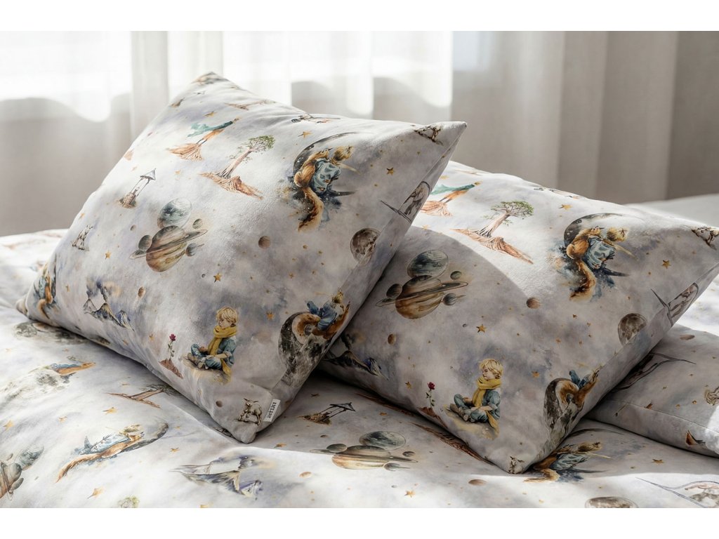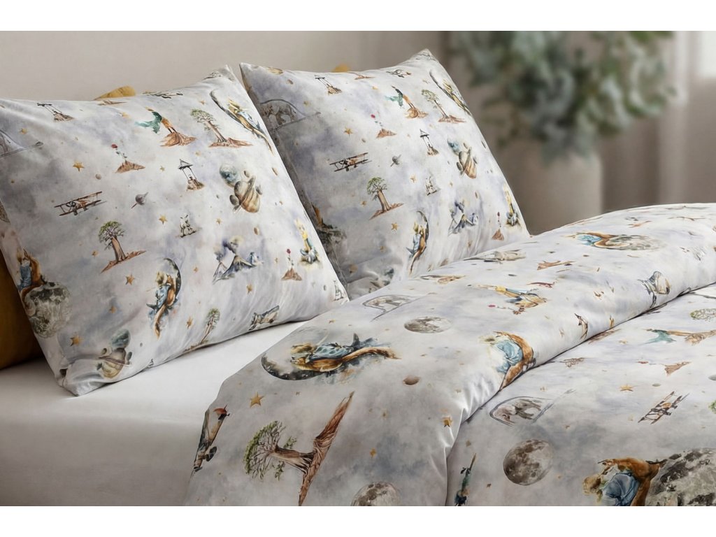 Naše obliečky sú symbolom kvality a tradície šité s maximálnou starostlivosťou priamo v Českej republike. Predstavujeme vám obliečky so vzorom Zasnený Malý princ, ktoré sú inšpirované kúzelným svetom Malého princa. Vzor na obliečkach zobrazuje ikonické scény z tejto nadčasovej knihy, ako je Malý princ stojaci na svojej planéte, ruže, líška či lietadlo, ktoré symbolizujú cestu plnú objavov a priateľstiev. Jemné pastelové odtiene a detaily hviezd vytvárajú pocit pokoja a fantázie.