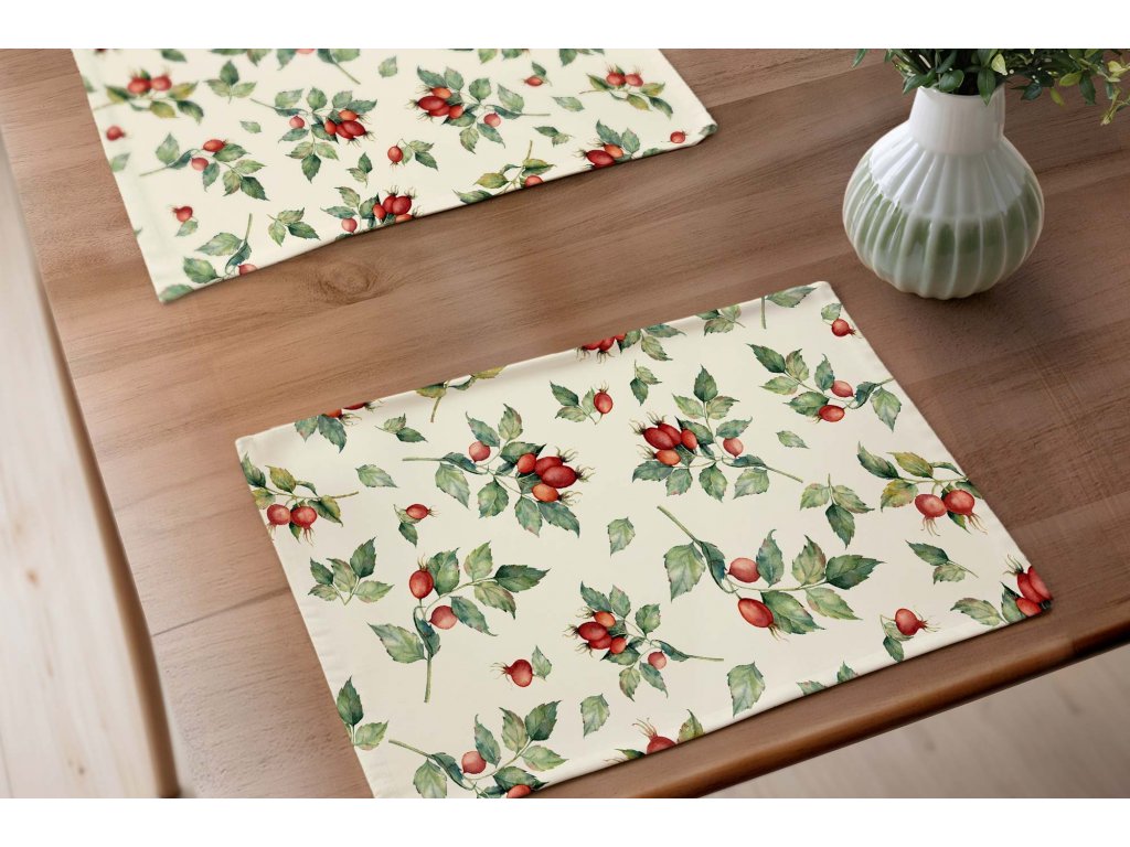 Prestieranie Šípky prináša do každej domácnosti dotyk prírodného pôvabu a zároveň pripomína tradičný vidiecky štýl. Na pozadí v prírodnom odtieni sa rozprestiera bohatý vzor zrelých šípkových plodov a svieže zelené listy, ktoré sú znázornené s ohromujúcim detailom, čo dodáva tomuto prestieraniu pocit autenticity a elegancie.