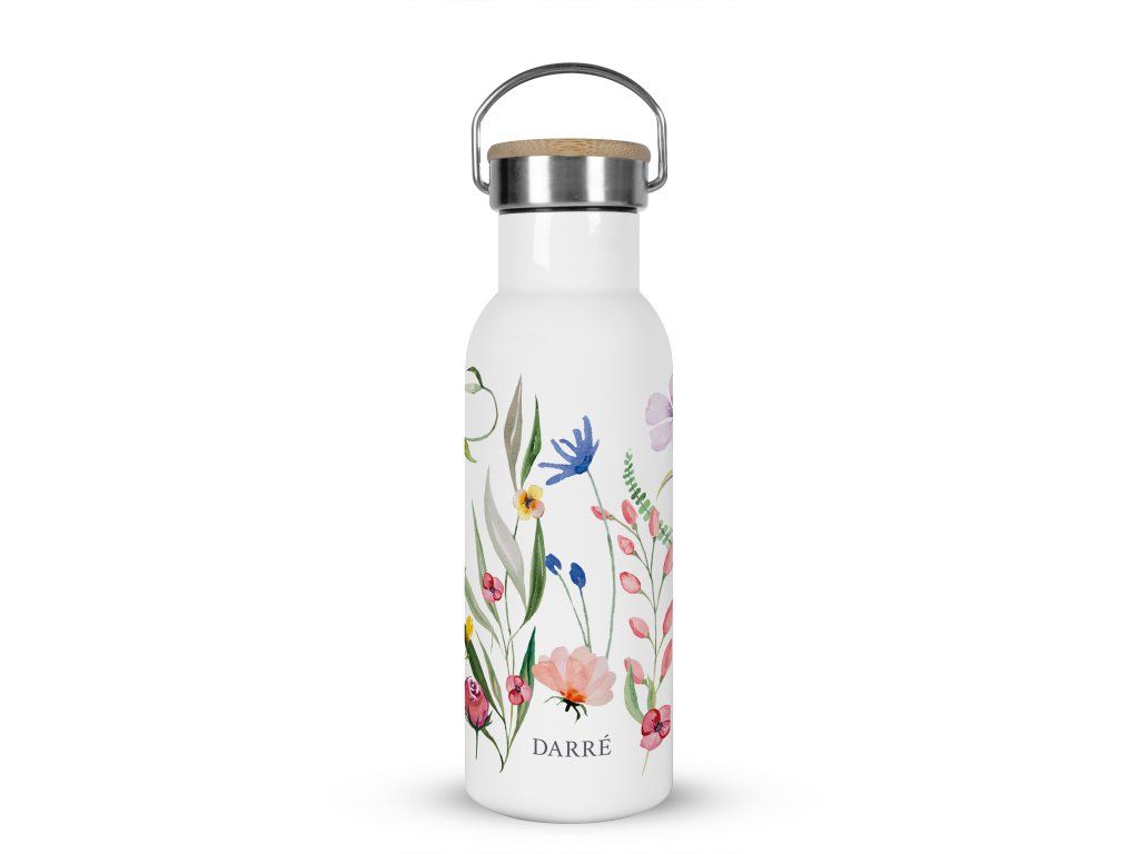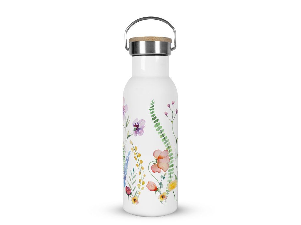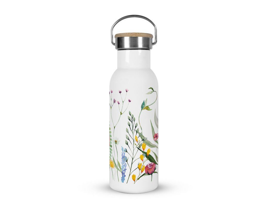 Nerezová termoska s bambusovým viečkom je štýlovým doplnkom, ktorým môžete nahradiť neekologickú plastovú fľašu na pitie. skrutkovací uzáver s praktickým sklopným nerezovým pútkom zaisťuje skvelé izolačné schopnosti. Termoska je skvelou voľbou na kávu, čaj, ale aj ďalšie horúce a studené nápoje. Gumené tesnenie zaručí, že sa vám váš obľúbený nápoj nevyleje. Bambusové viečko zdobí gravírované logo. Farebné kvety vás prenesú na rozkvitnutú lúku a navodia u vás doma príjemnú atmosféru.
